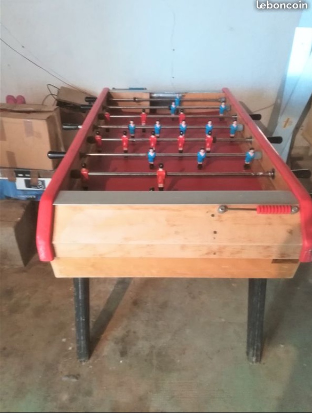 - Le - : tapis à changer (si plateau et angles ok, coût de 40 à 70 €), pieds à rénover (syntobois et peinture, 10 à 30 €), ponçage et vernis de la structure (40€), pas de traverse de maintien des pieds apparente (vérifier stabilité), sortie de balle bizarre (pas sûr qu'elle soit d'origine), poignées non uniformes (pas d'origine), le système de fermeture (mastoc), pas de monnayeur on dirait (à moins qu'il soit côté opposé car le baby à s'ouvre ), buts simplistes ou incomplets (on dirait que la plaque métal du dessus n'est pas d'origine, dépasse sur photo 1)