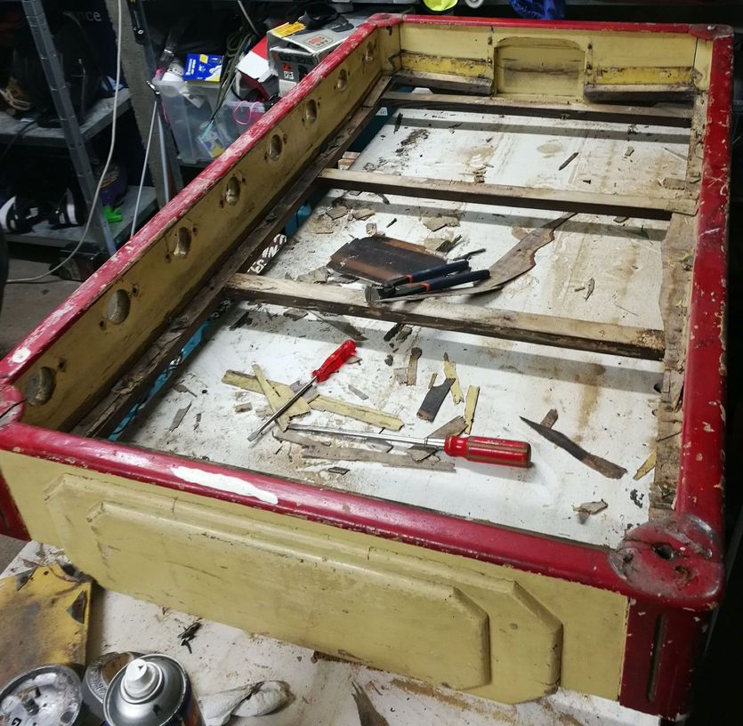 voici mon avancement j'ai tout démonté, je vais changer le tapis ( qq trous de cigarettes ). J'ai commencé à poncer les joueurs ainsi que les barres.