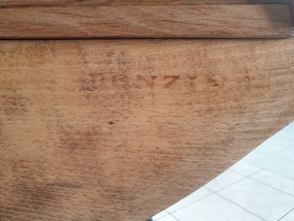 Son aspect est un peu moyen (sur les photos) : Le ponçage n'a a priori pas permis de récupérer l'aspect d'origine (soit du fait des traces d'humidité ou d'une teinture plus foncée à l'origine). Il a été reverni.